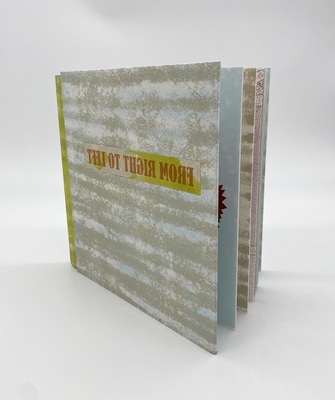 Unidentified Found Object Song is a 16-page bound book housed in a drop spine book enclosure by AB Gorham. The covers feature a protruding shape covered in book cloth that reminds viewers of flying saucers or other unidentified flying objects. The book’s visuals vary from solid saturated colorful shapes to soft gradients. The text in UFO Song is fragmented and lyrical, contributing to the book’s unknown and intriguing nature. The text draws on written experiences of aliens in encounters and creates a playful space where the reader can reflect upon the idea of truth and understanding. It is through these written experiences, like the ones described throughout UFO research and within books like Allen Hynek's 'Project Blue Book', that Unidentified Found Object Song is able to create the book's enchanting atmosphere. The text and visuals come together to create a mysterious and dreamlike reading experience.