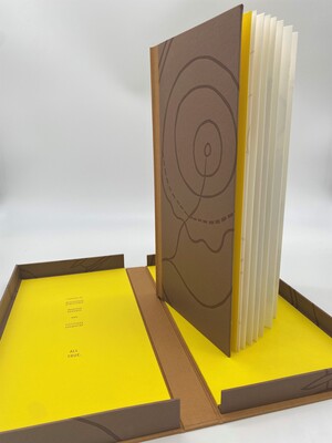 The Pocket Sky Atlas by Stephanie Wolff is a carefully crafted book that begins with its design, featuring a small rectangular box that echoes the book's cover material. Upon opening, readers encounter a title page and a poignant dedication that reads "For all those who look up," setting the tone for a contemplative exploration of the sky.The interior of the book is thoughtfully designed, with monotype depictions of skies occupying the right-hand pages, accompanied by carefully selected quotes on the corresponding left pages. These quotes represent a diverse range of voices—from renowned historical figures to more obscure, everyday observers—creating a rich tapestry of human perspectives on the celestial landscape. Each sky is rendered in full bleed, using a palette limited to blue and gray, which creates a sense of simplicity and depth. The book's innovative design includes a stepped foredge, where each page is slightly shorter than the one preceding it. This clever technique allows the edges of multiple skies to be visible when the book is first opened, creating a layered visual experience. A particularly engaging feature is found at the book's conclusion: a pocket containing a volvelle. This spinning overlay reveals small, intricate portions of the sky, each meticulously matched to the interior page illustrations. This interactive element invites readers to engage more deeply with the visual narrative. Ultimately, the work is a profound meditation on the sky, celebrating humanity's enduring fascination with and appreciation of the celestial realm throughout centuries of observation and wonder.